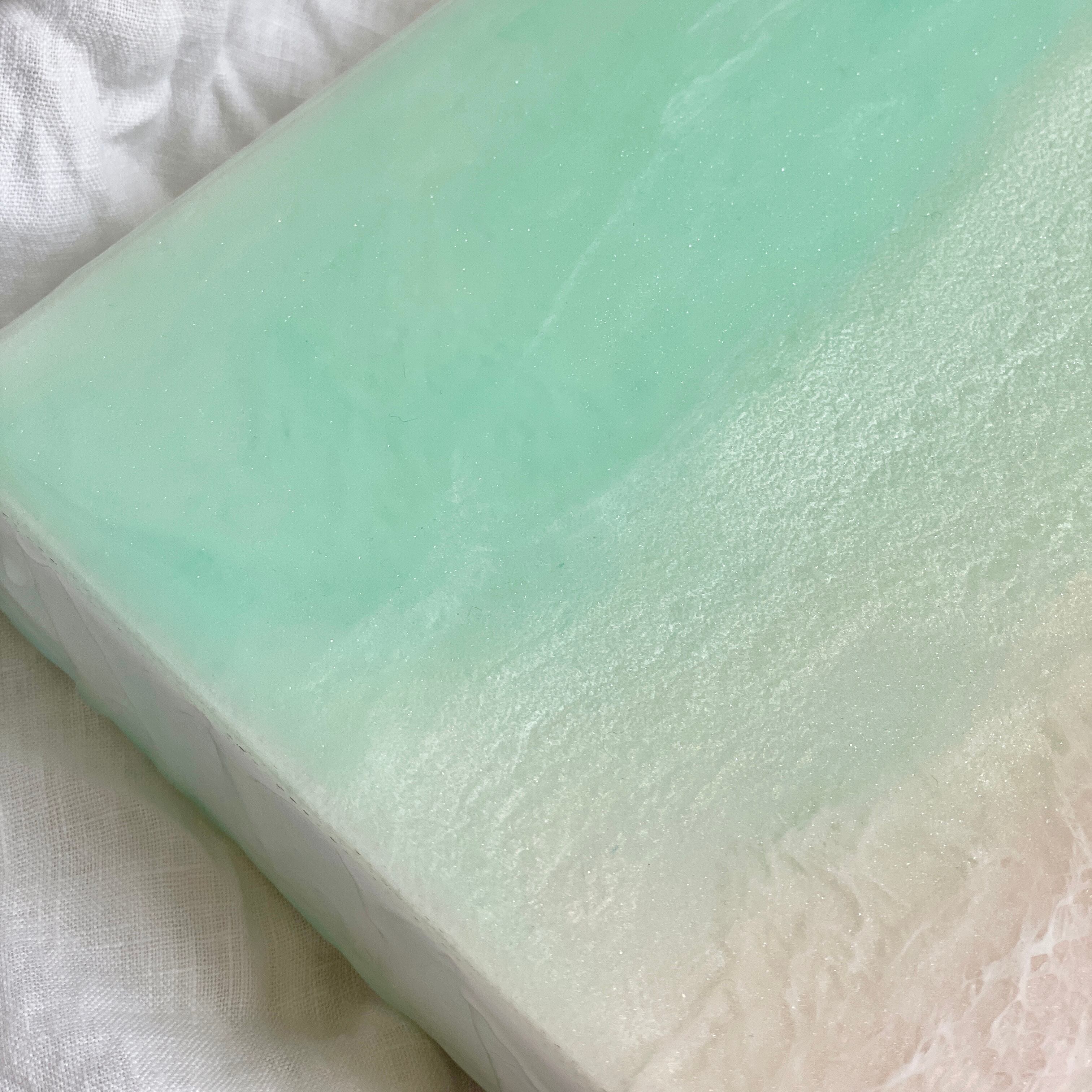 アート用キャンバスパネルに、レジンを一層一層重ねて海を描いています。