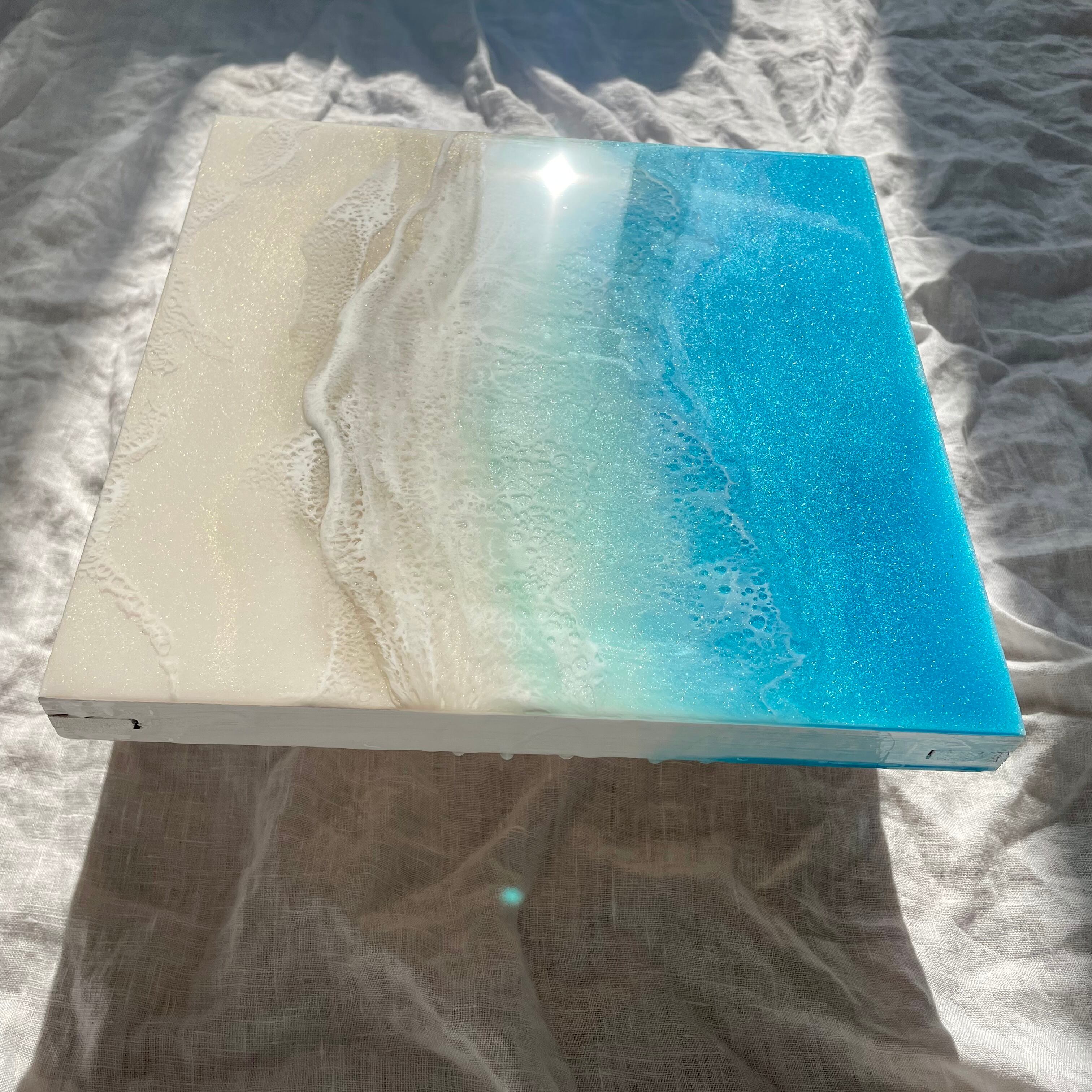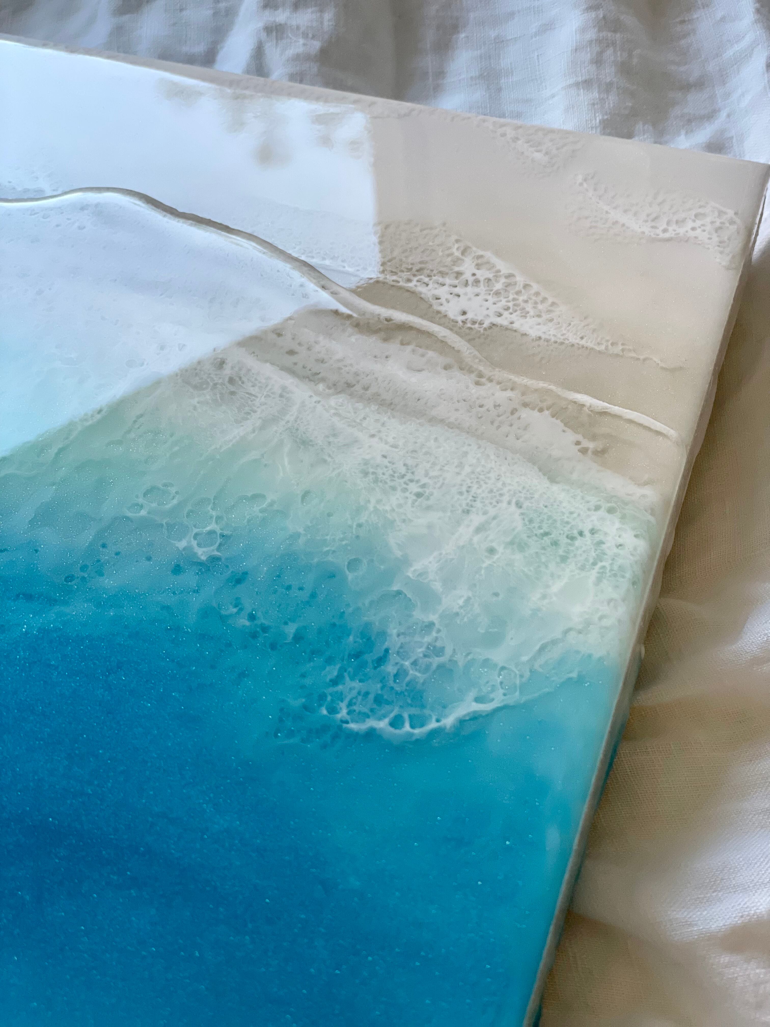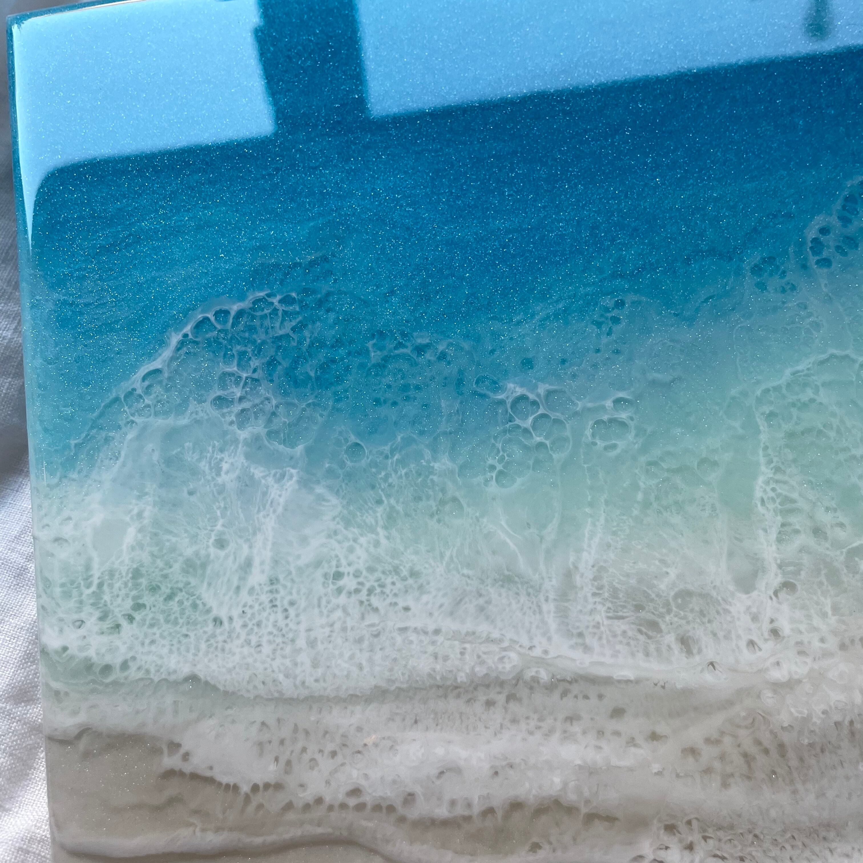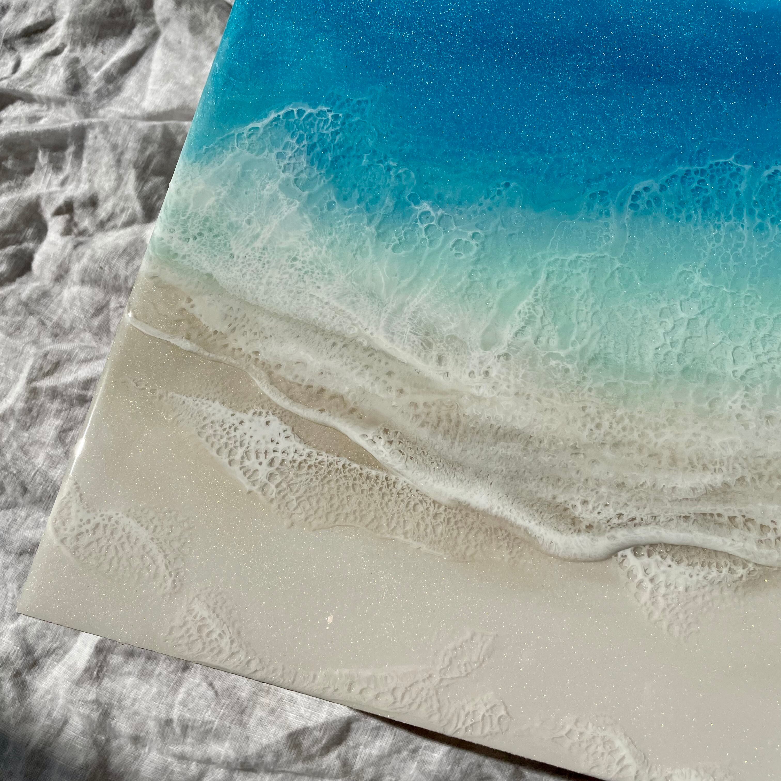 アート用シナベニヤパネルに、レジンを重ねて海を描いています。