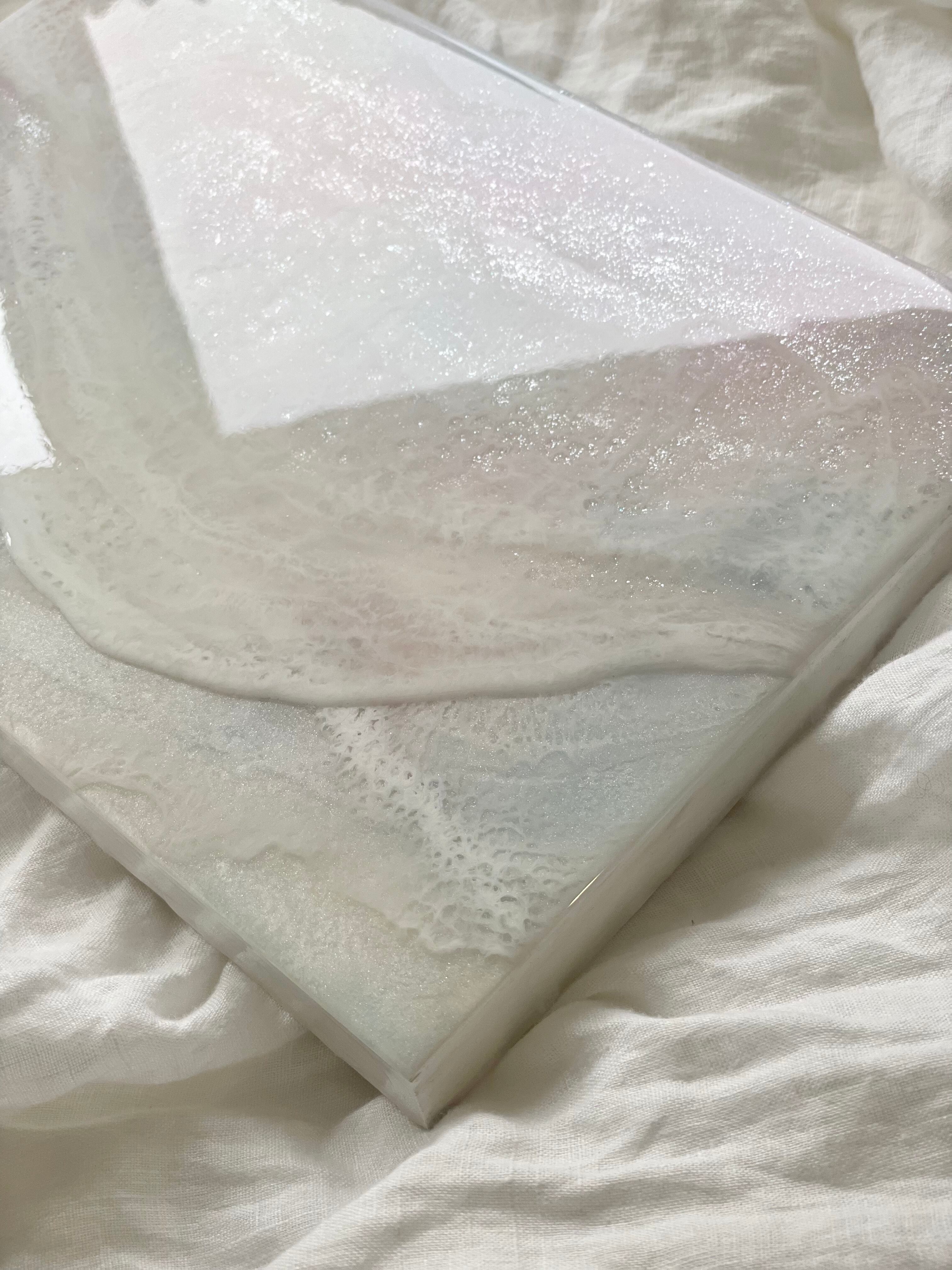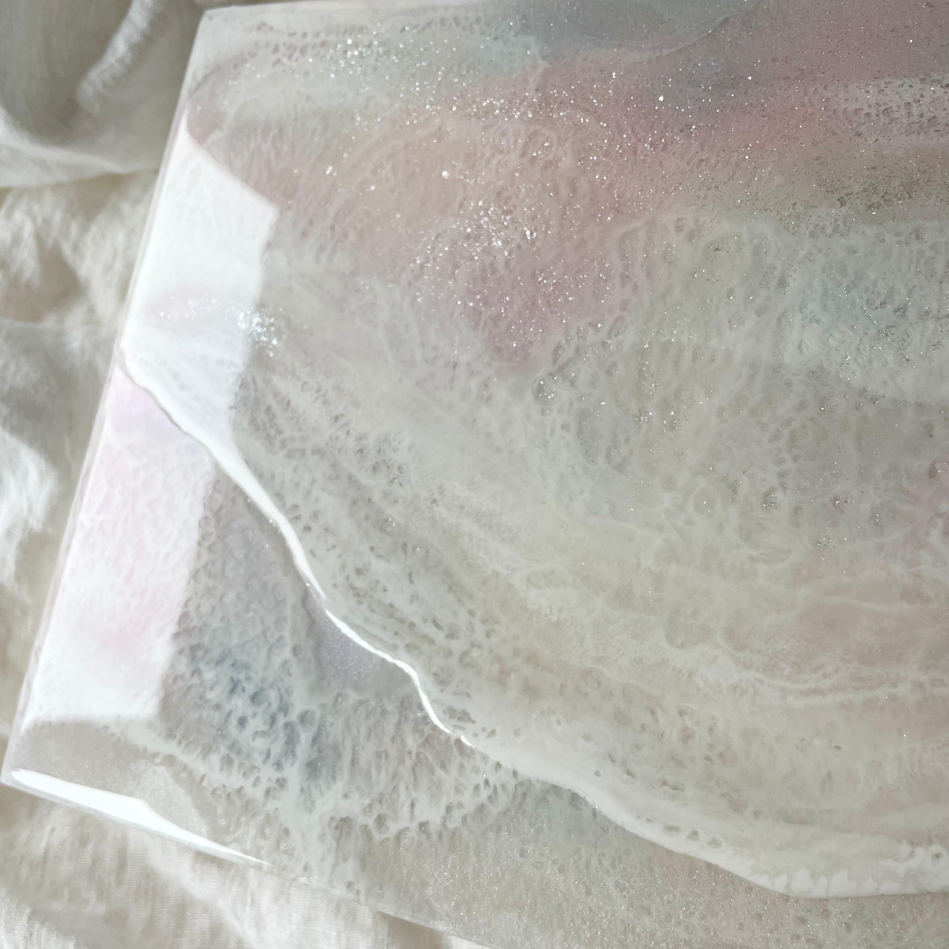 まっさらなパネルにレジンを流し込み、層が硬化後、その上からさらに層を重ねていき、奥行きのある作品作りを心掛けております。一枚完成するのに数日かかりますが気持ちを込めてお作りしております。