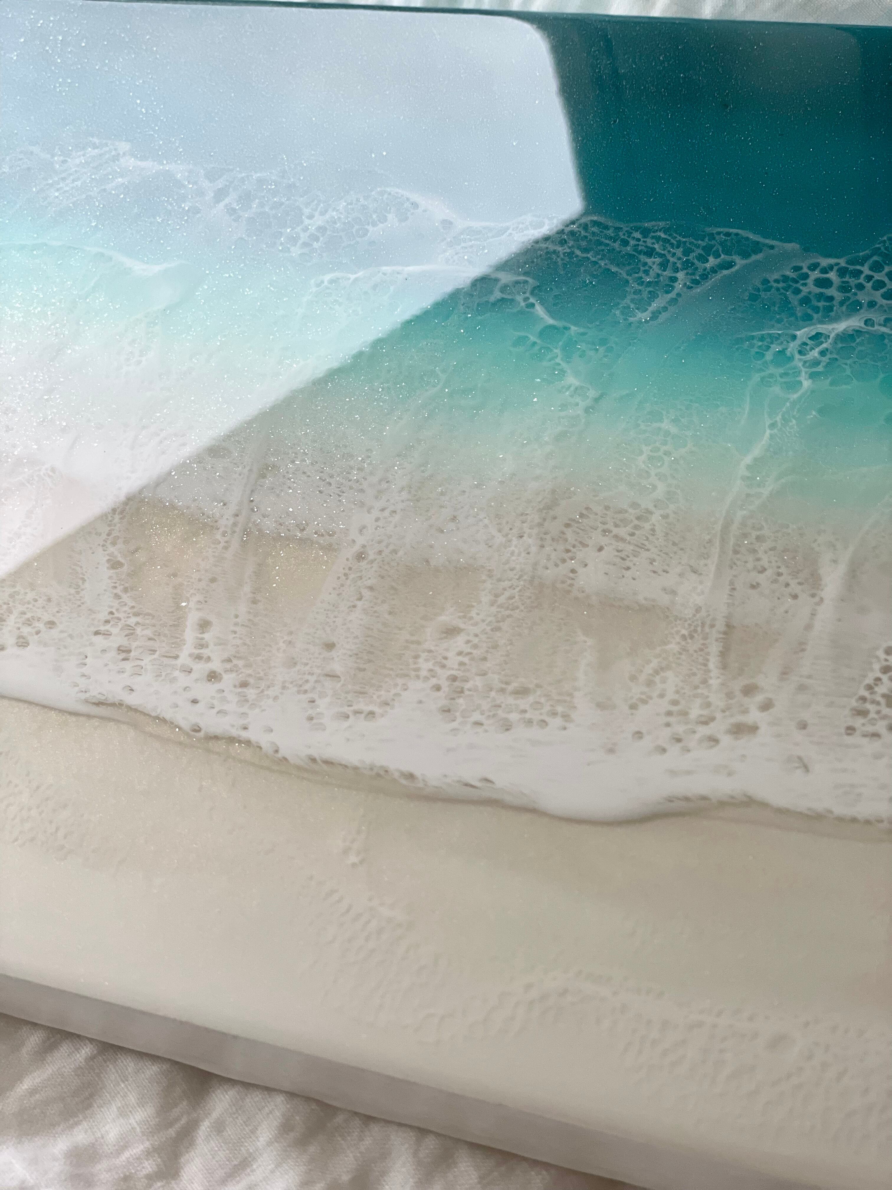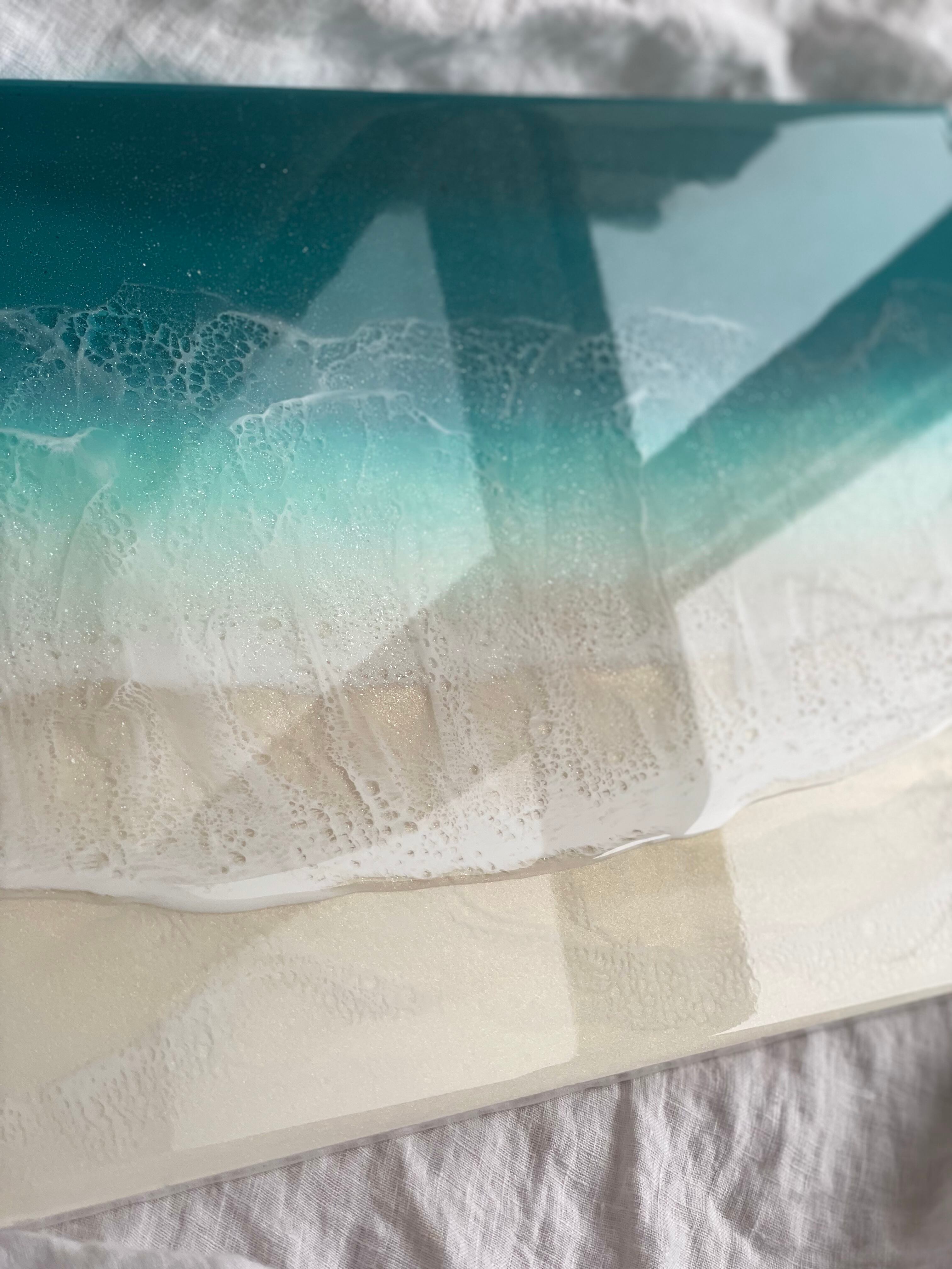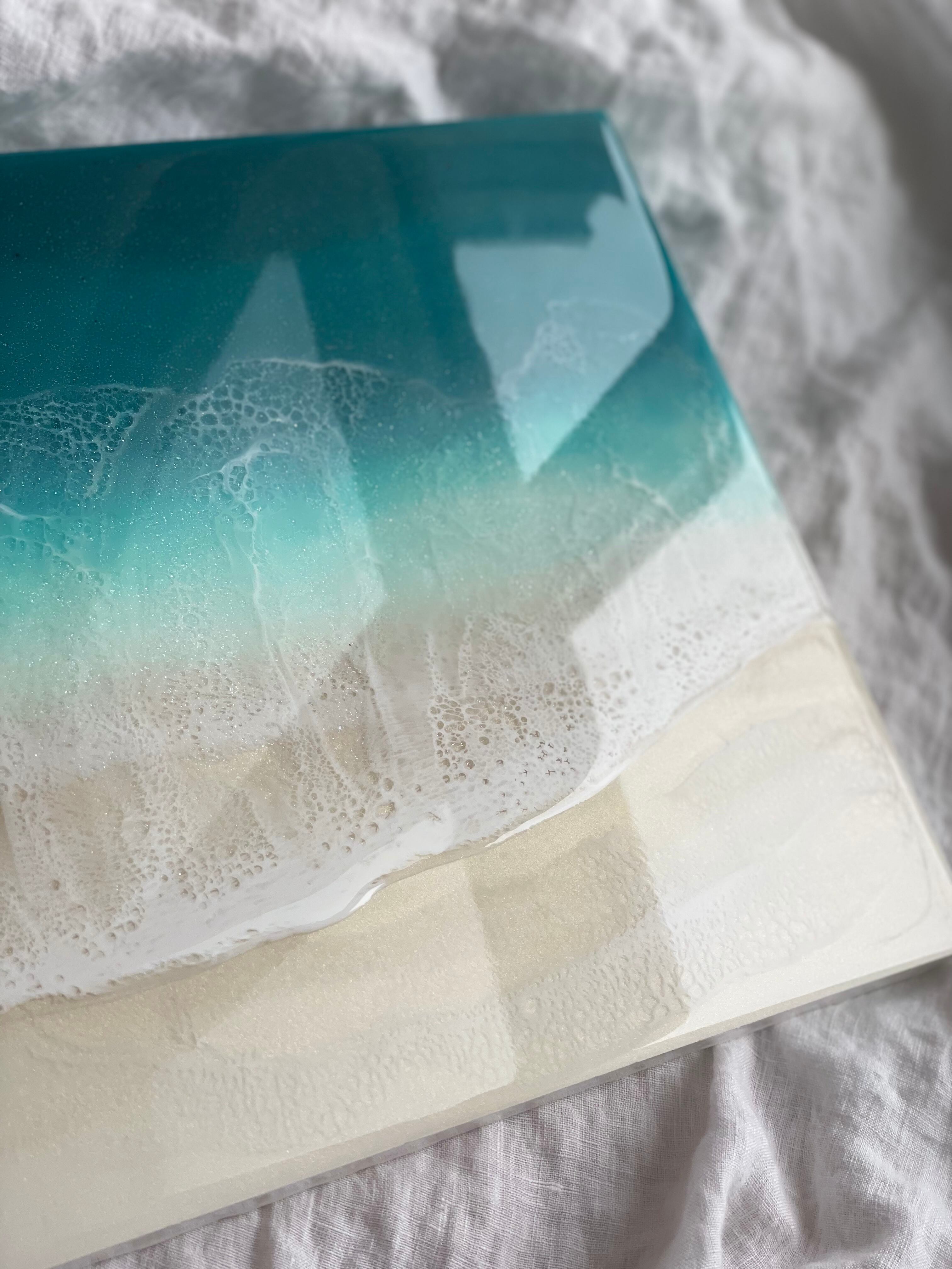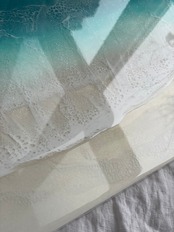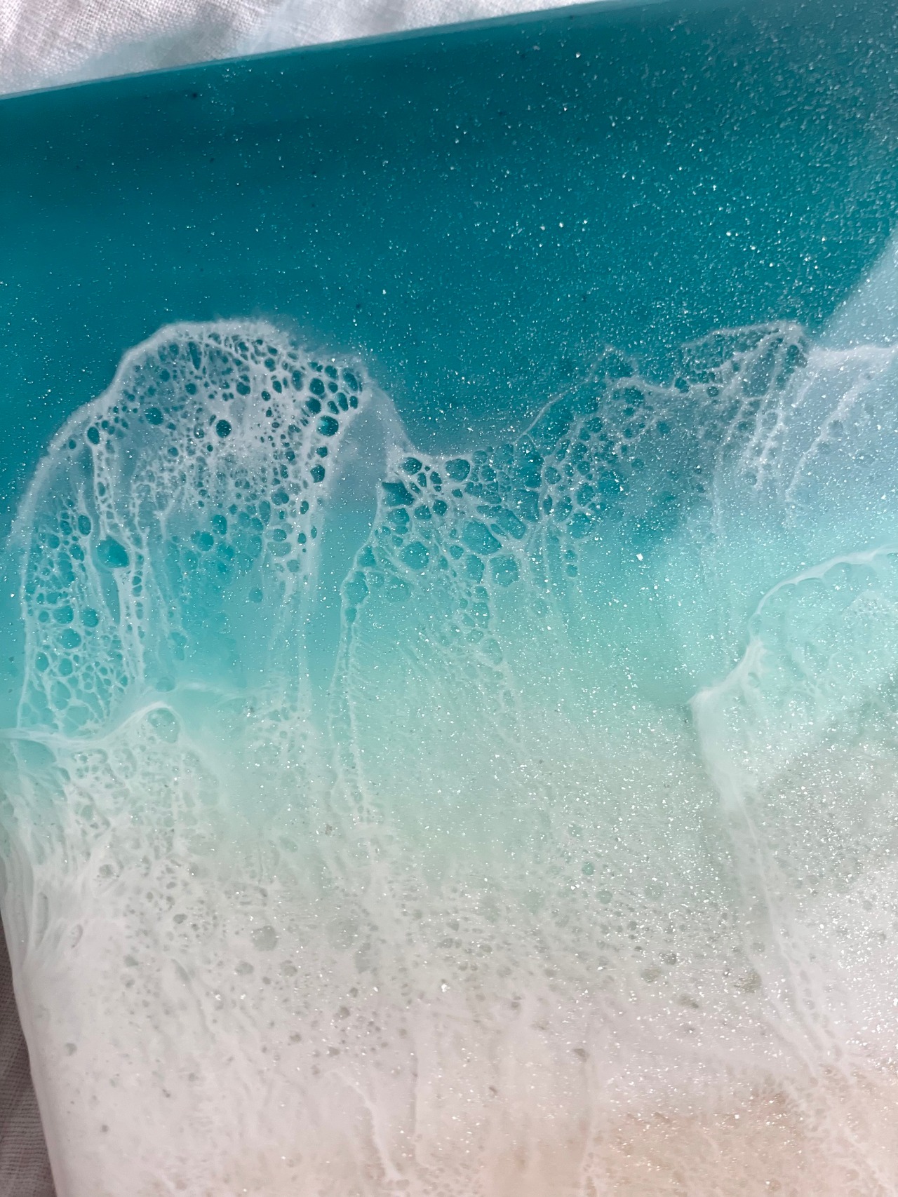 アート用シナベニヤパネルに、レジンを重ねて海を描いています。層が硬化後、その上から層を重ねていき、奥行きのある作品作りを心掛けております。一枚完成するのに数日かかりますが気持ちを込めてお作りしております。