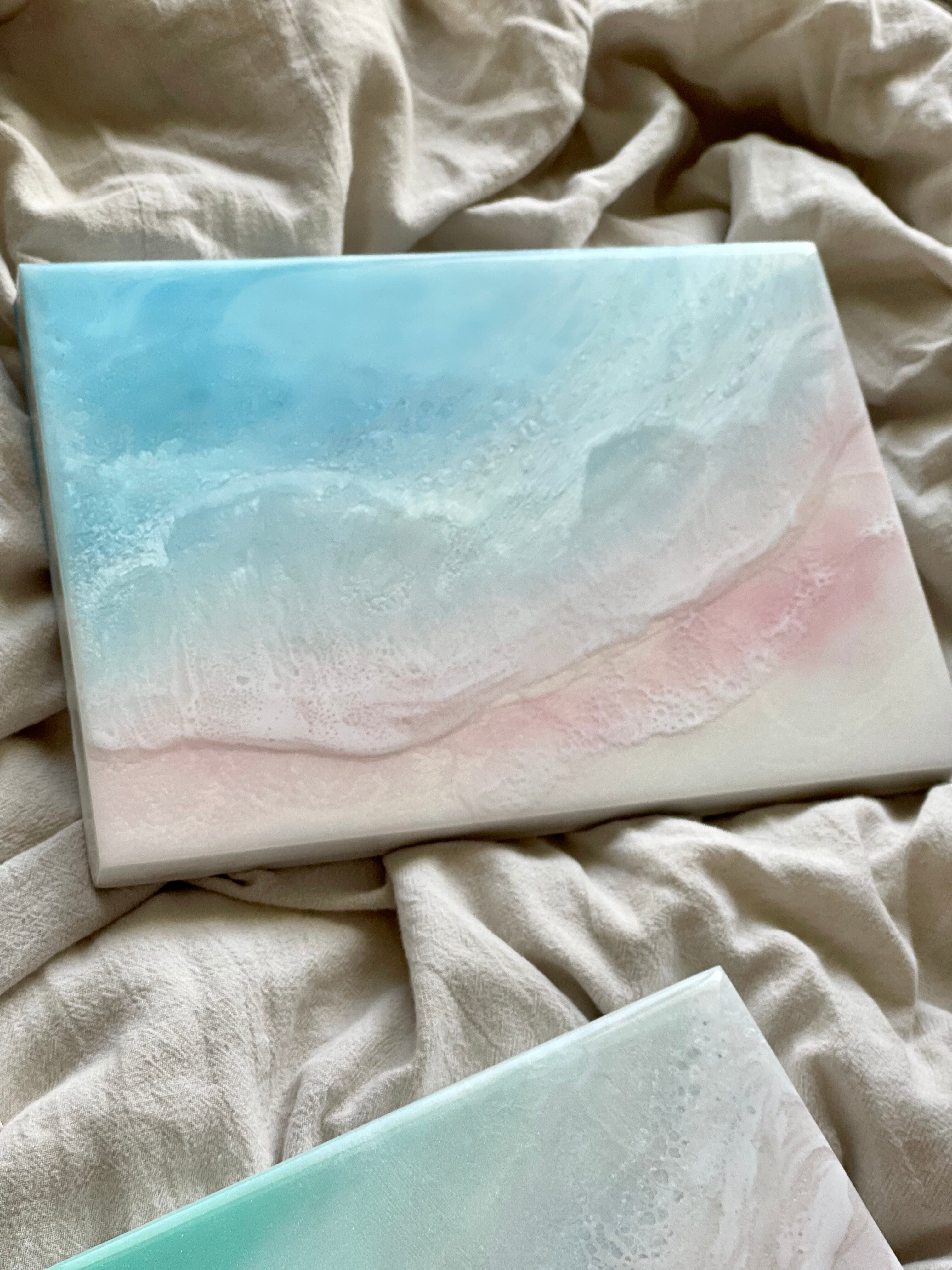 アート用シナベニヤパネルに、レジンを重ねて海を描いています。