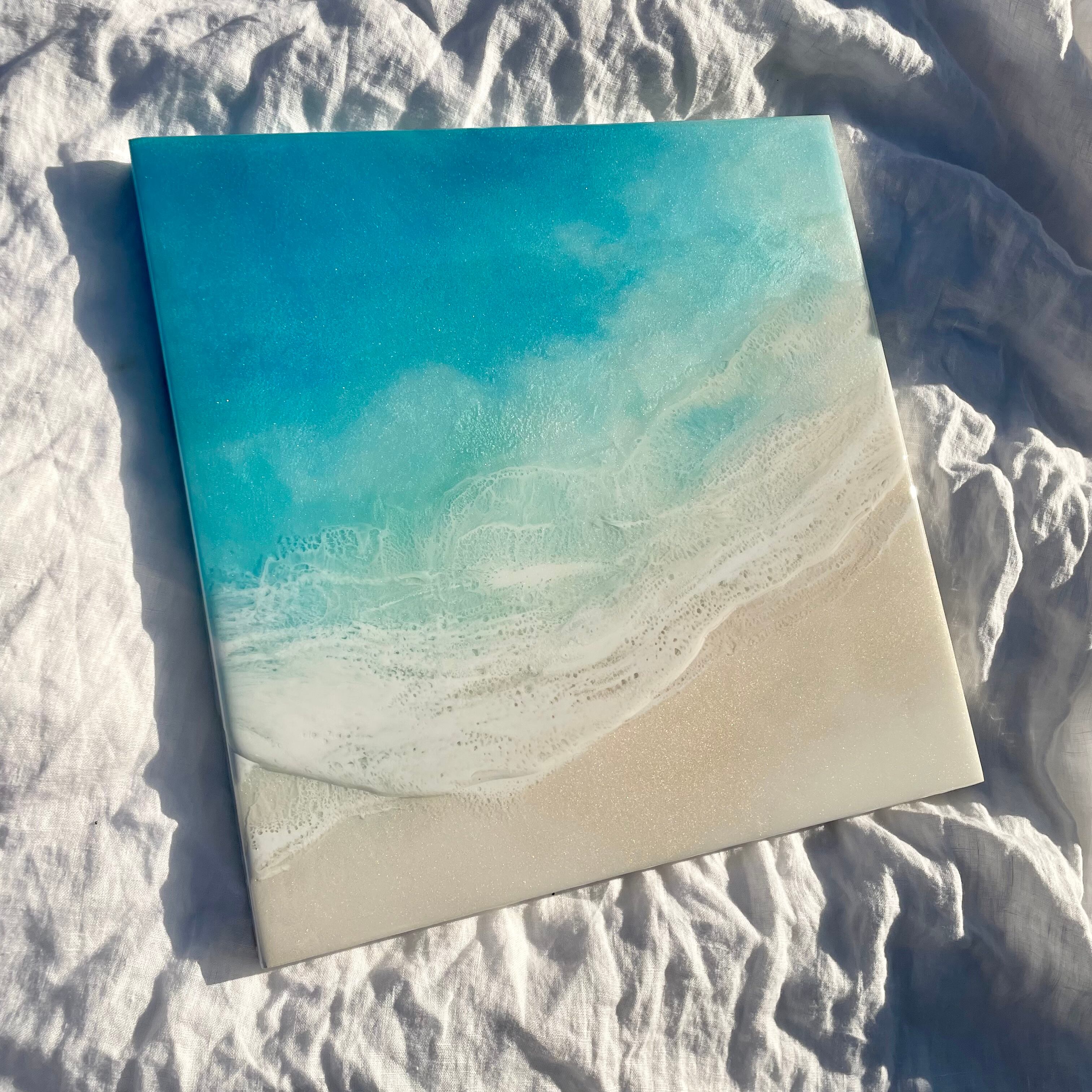 アート用シナベニヤパネルに、レジンを重ねて海を描いています。