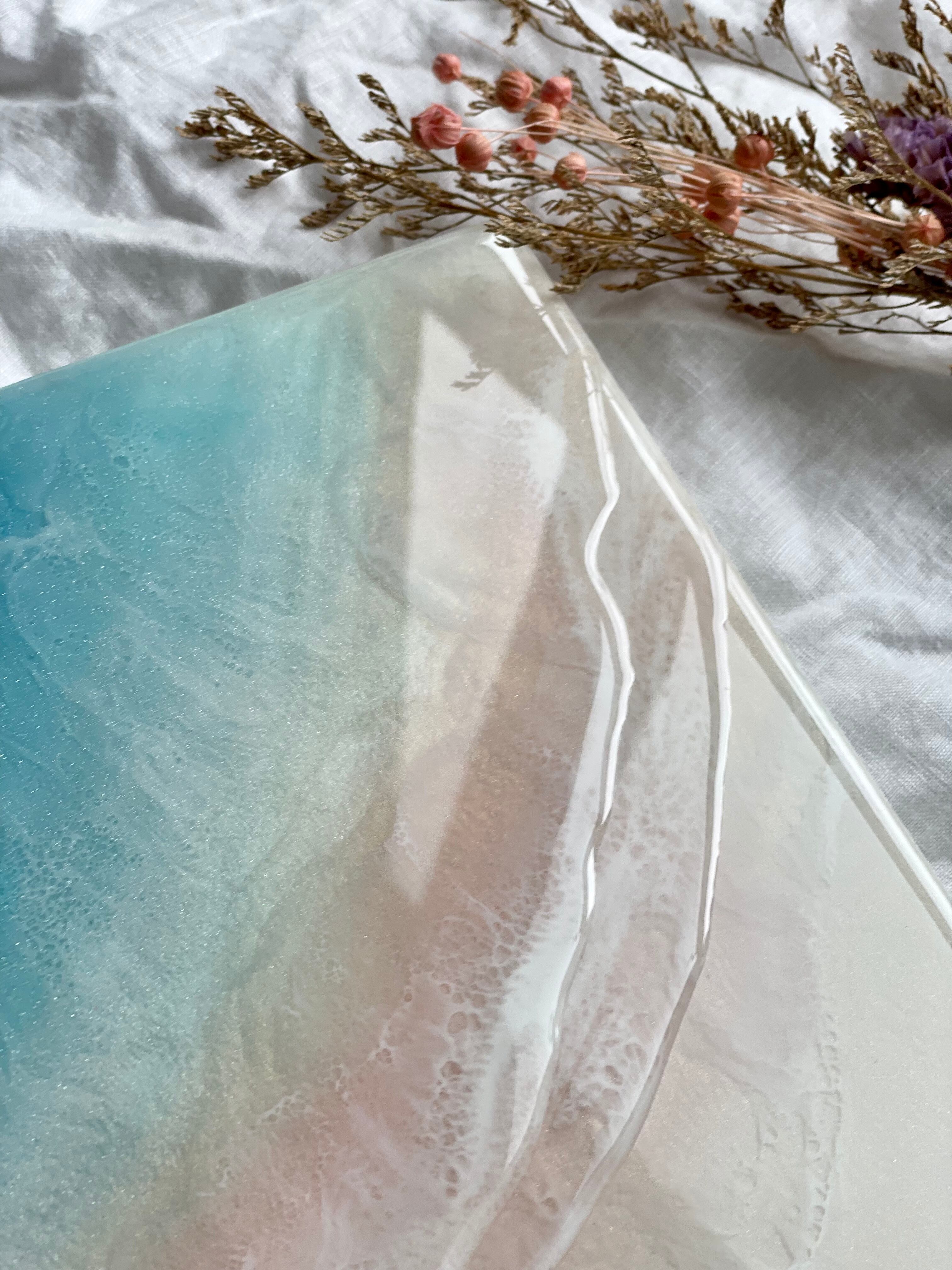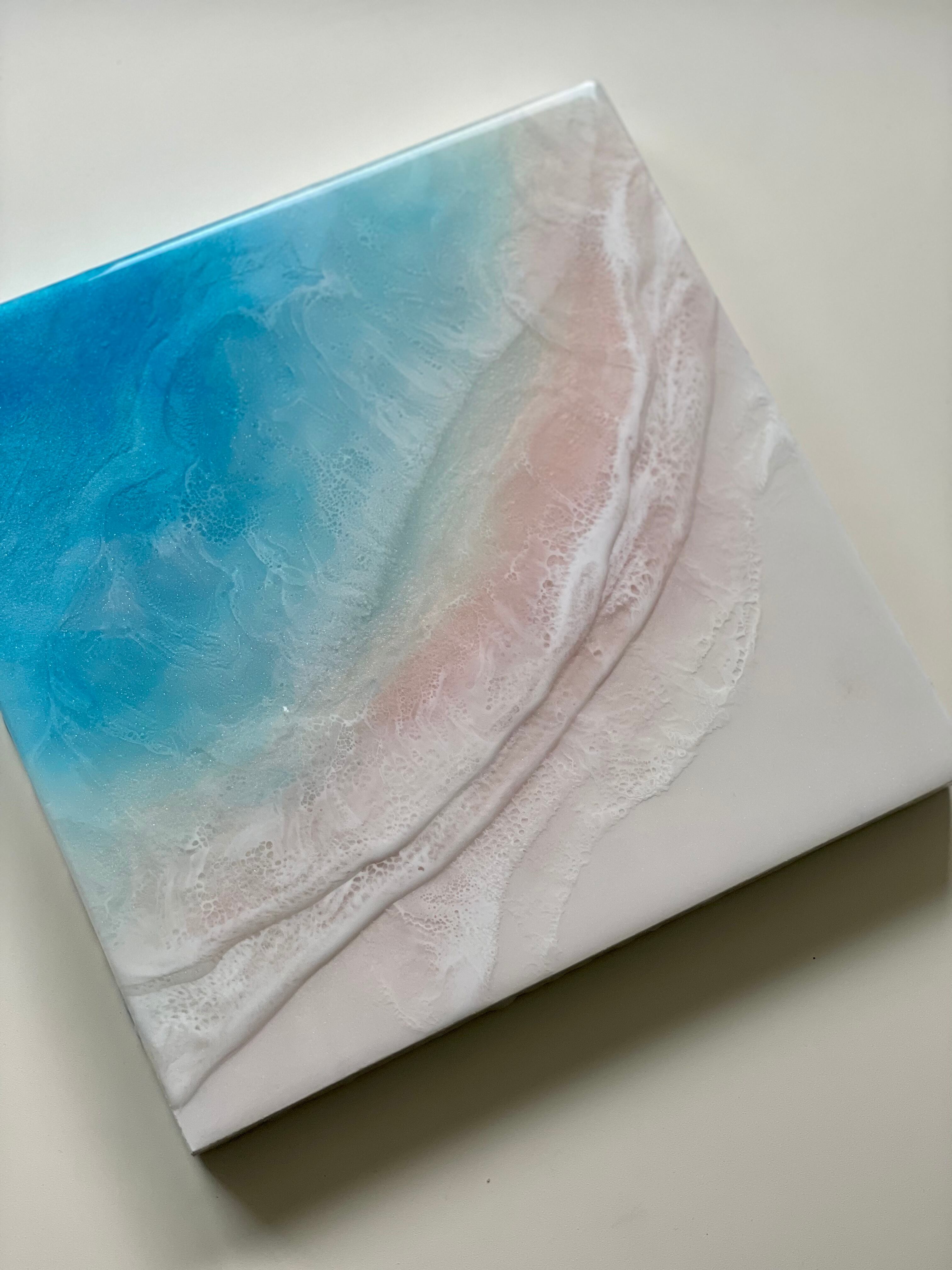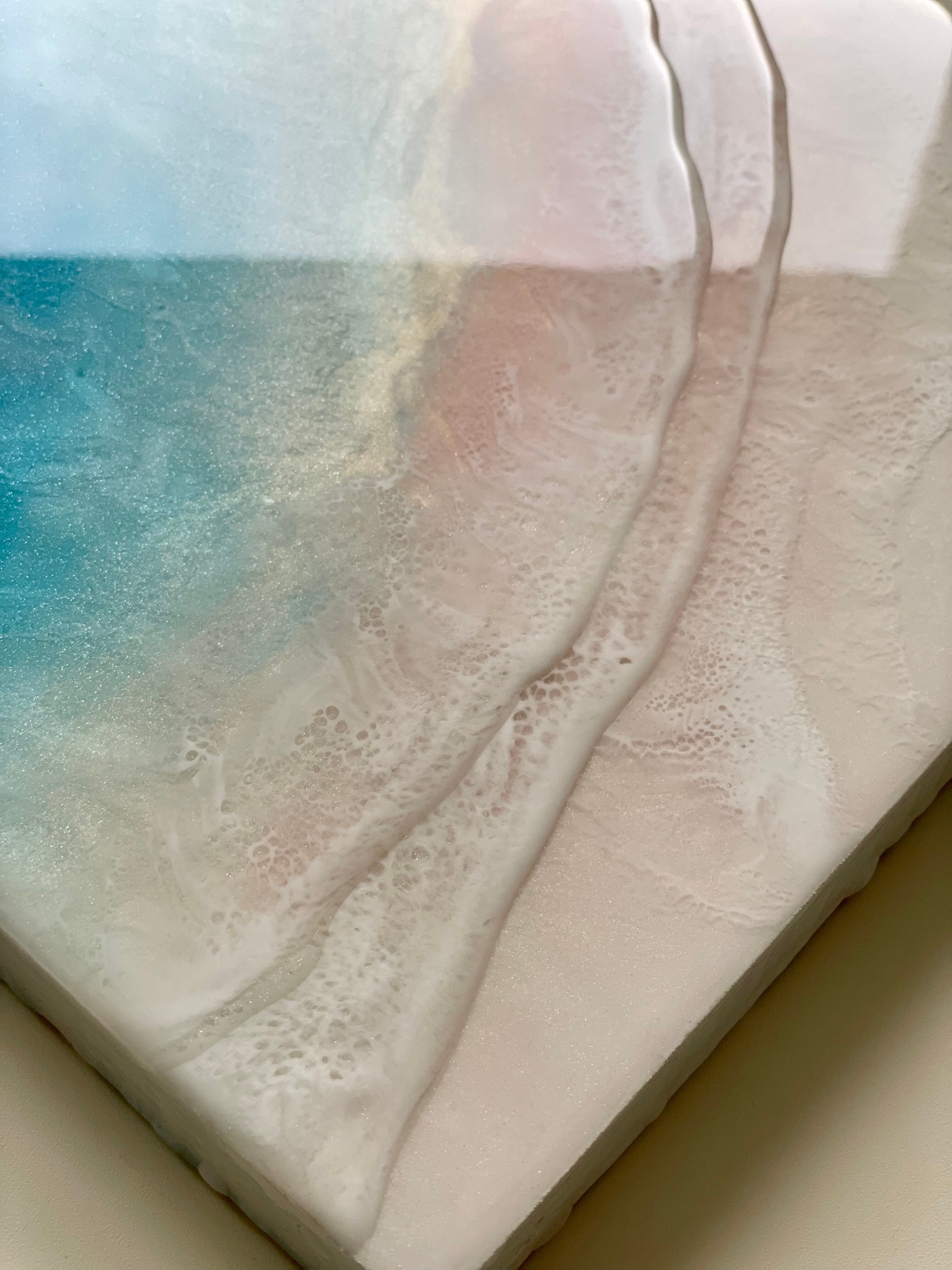 アート用シナベニヤパネルに、レジンを重ねて海を描いています。