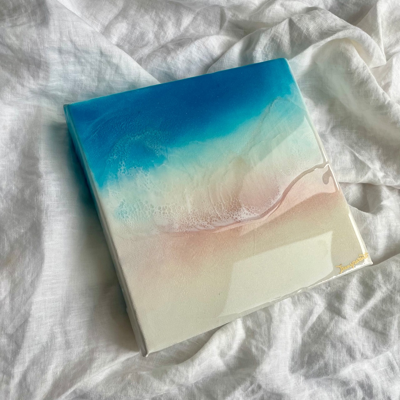 アート用キャンバスパネルに、レジンを一層一層重ねて海を描いています。