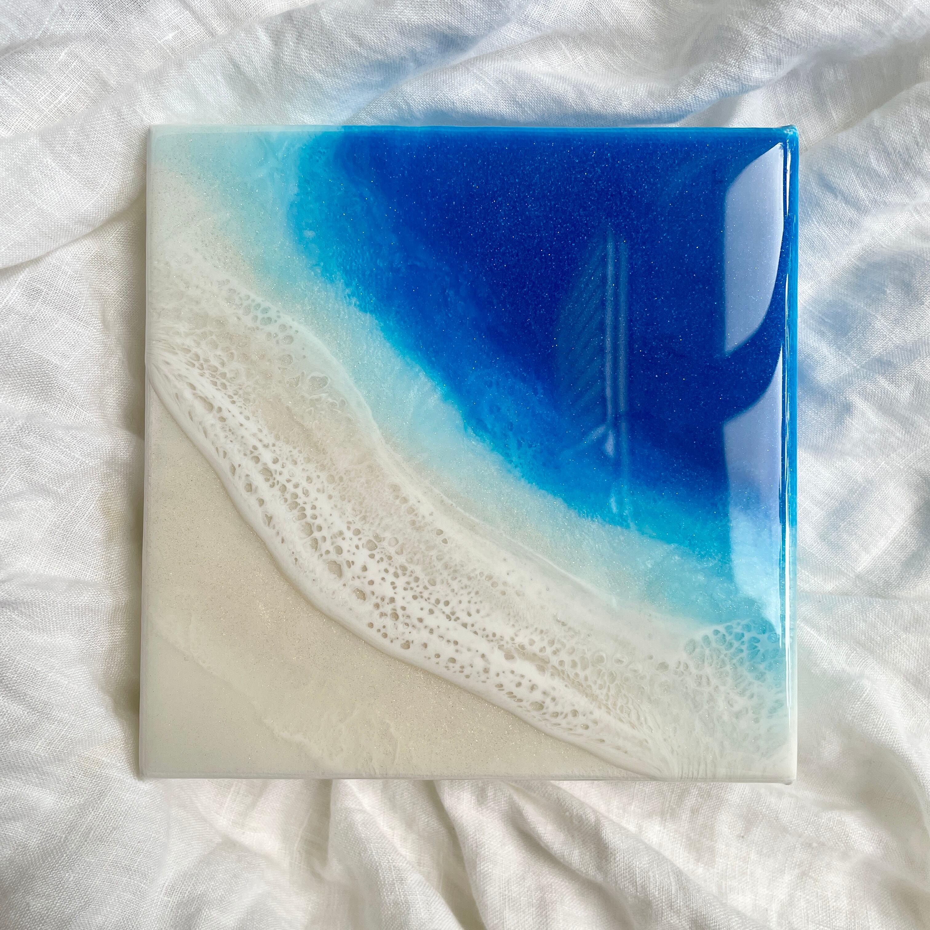 アート用ファブリックパネルに、一層一層レジンを重ねて海を描いています。