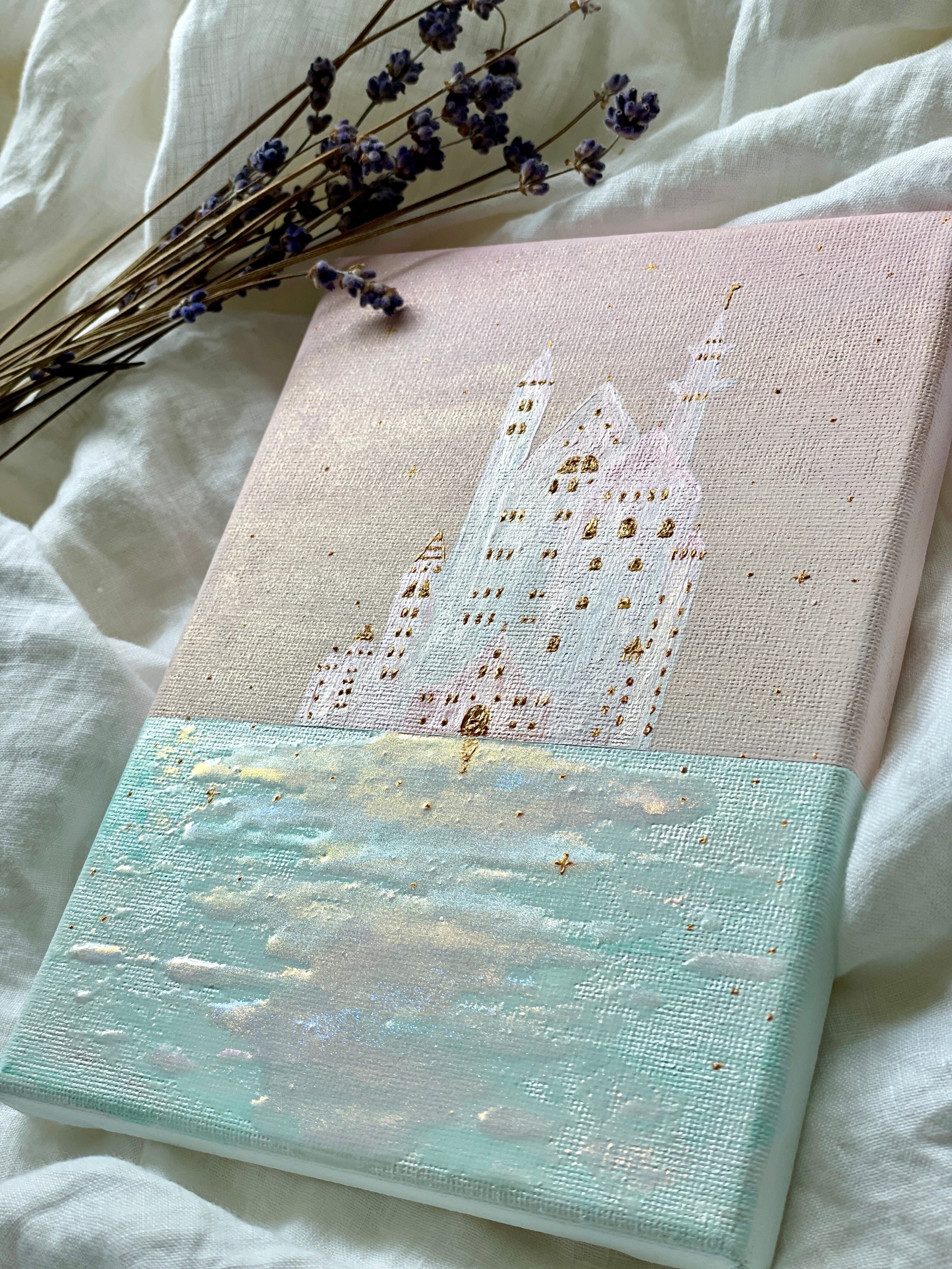 パールのようにきらめく水面と、淡いピンクグラデのお城が特徴の作品です。