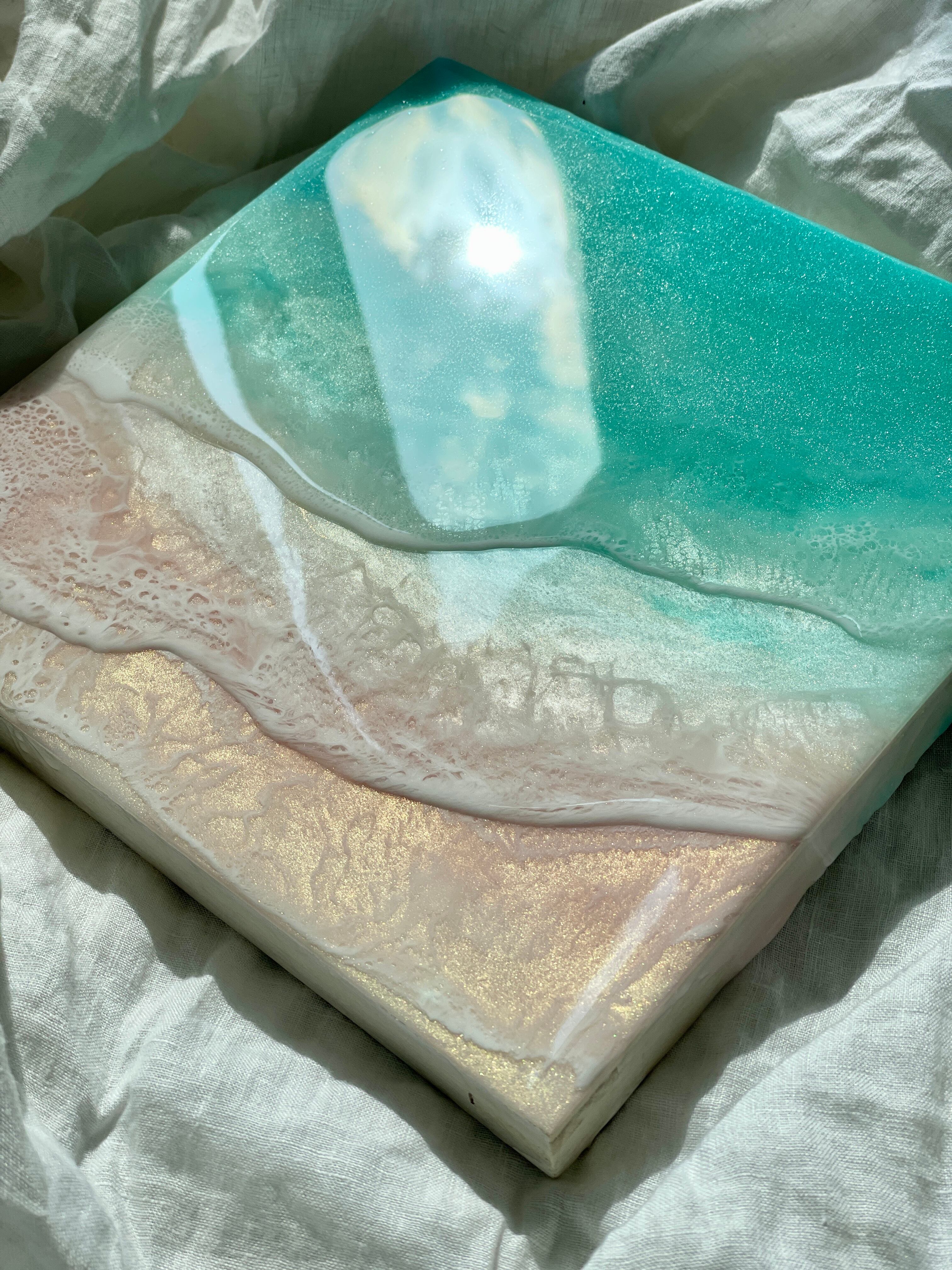 アート用ベニアパネルに、一層一層レジンを重ねて海を描いています。
